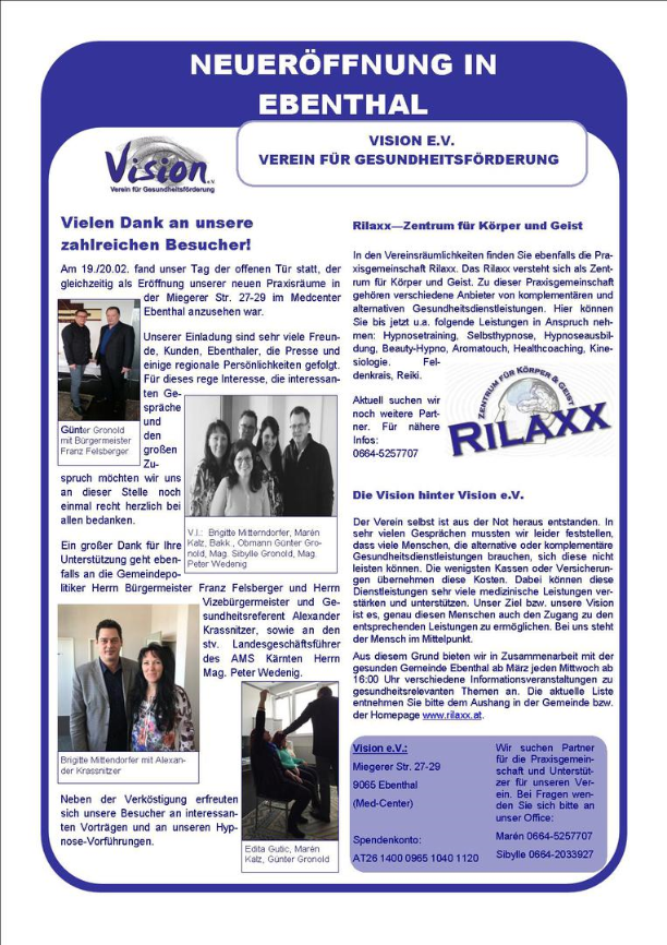 Ab sofort biete ich meine Dienstleistungen nun auch im Rilaxx - Zentrum für Körper und Geist, im Medcenter in Ebenthal an. Während der Eröffnung des Rilaxx, am Freitag den 19.02. und Samstag, den 20.02.2016 habe ich bereits erste sehr interessante Gesprächen mit den Besuchern führen können. Des Weiteren hat der Verein Vision an diesen beiden Tagen jeweils eine Sitzung bei mir verlost.